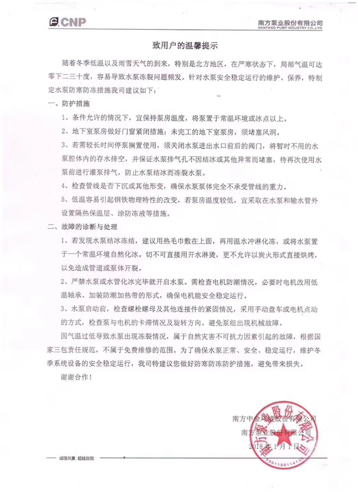 杭州南方泵業(yè)教你水泵如何防凍 日期:2018/1/10 13:49:49 | 人氣:558 | TAG 水泵防凍 昆山卡尼爾主要銷售南方泵業(yè)股份有限公司的離心泵、污水泵、水泵配件等,最近溫度降低,水泵也需要防凍,下面就來看看杭州南方水泵給大家的一些建議如下: