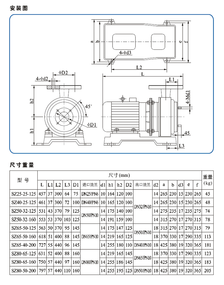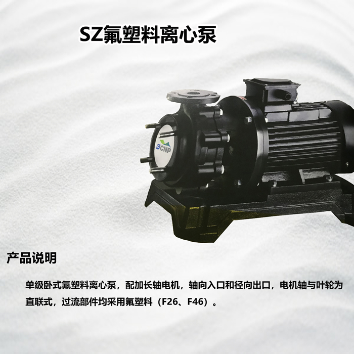 南方SZ單級臥式氟塑料離心泵,配加長軸電機,軸向入口和徑向出口,電機軸與葉輪為直聯式,過流部件均采用氟塑料(F26、F46)。